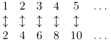 Where things get interesting is when the sets are infinite. For example, consider the set of all positive integers {1, 2, 3, … } and the set of all even positive integers {2, 4, 6, … }. It would seem that the first set is larger, but since any element n in the first set can be matched uniquely to 2n in the second, we can actually show that both sets are the same size.