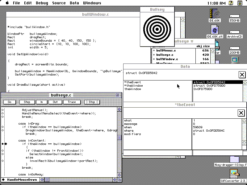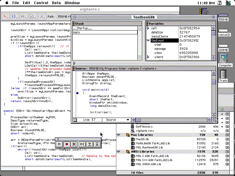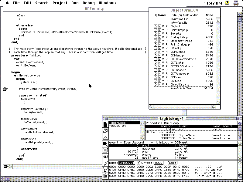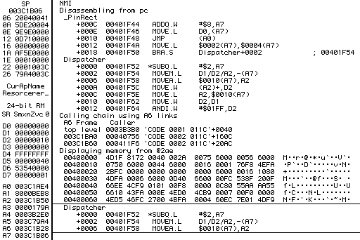 At the very lowest level, a Macintosh developer had available a free utility from Apple called MacsBug. (It stands for Motorola Advanced Computer Systems Debugger - the "Mac" part of the name is purely co-incidental.) And what a program this was! If installed, you could drop into it via a non-maskable interrupt at any particular time, configure your program to drop into it via a Toolbox call, and the operating system dropped into it when there was a System Error. Using it, you could examine and change memory, disassemble and trace through code, set breakpoints, examine the stack and heap, and many other wonderful things. I have to admit I first learnt to use it as a way of getting past cripple-ware restrictions or avoiding "deaths" in shoot-em type games.