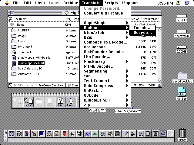 - Stuffit 1.5.1 (1988), 3.6 Lite (1997), Deluxe 4 (1996), Deluxe 5.5 (1999), Deluxe 6 (2000), Expander 3 (1996), 4 (1996), 5 (1999), Drop Stuff 4 (1996). 5 (1998), Compact Pro 1.33 (1992), 1.5 (1994), BinHex 4 (1985)