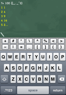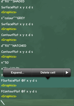 The iPhone/iPad interface supports cell-based interactive entry with expandable cells for graphics and large text output. It also supports free text entry in worksheets analogously to the Worksheet pane in the Mac version. A custom keyboard accessory presents all the required symbols that are not present on the default alphabetic and numeric keyboards, thus minimising the required keyboard switching.