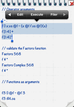 The Worksheet pane is the primary area for entering commands. Any rich text can be entered into the Worksheet – not only calculation instructions, and auto-completion is supported via the escape or F5 keys (showing built-in functions and variables by default, user functions and variables if the option key is pressed). Shift-enter sends either the selection or the current line if no selection to the interpreter. Multiple line selection is supported. The commands are echoed in the "Session" area in green following a '#' prompt, and any corresponding output follows in blue. Error messages appear in red and execution halts at the first error. Print, by default, will print the Session pane. Holding down the option key will cause the print function to print the Worksheet instead.